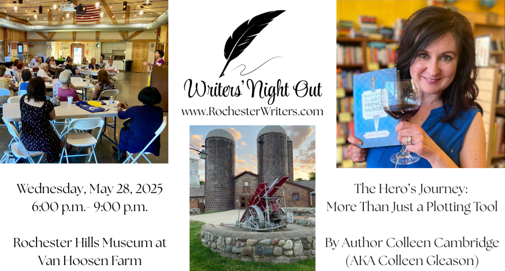 Writers’ Night Out is a chance to meet and mingle, to gather and connect, and to learn. The goal is to bring Rochester Writers into the community with a speaker, food & beverages, museum tour, raffle, and networking. This year’s Writers’ Night Out will again be held at the Rochester Hills Museum at Van Hoosen Farm in Rochester Hills on Wednesday, May 28, 2025 from 6:00 p.m. to 9:00 p.m. and will feature author Colleen Cambridge (AKA Colleen Gleason).